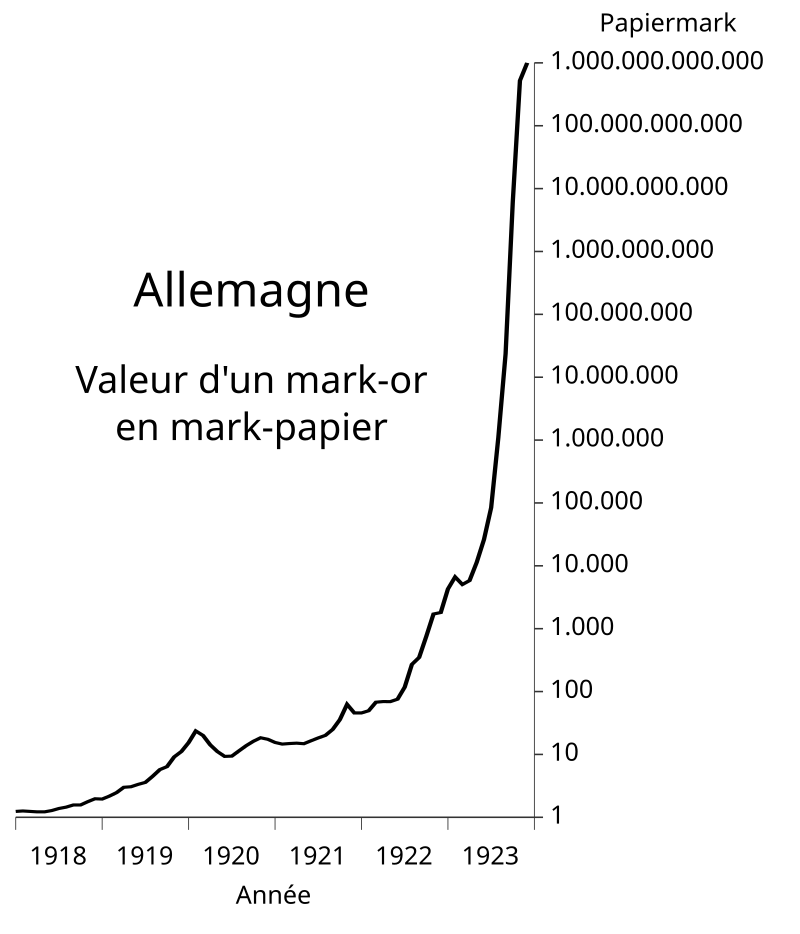 Le graphique ci-contre illustre bien la croissance exponetielle de la valeur du Mark de 1918 à 1923. Les conséquences pour l’économie et les familles ont été catastrophiques.
